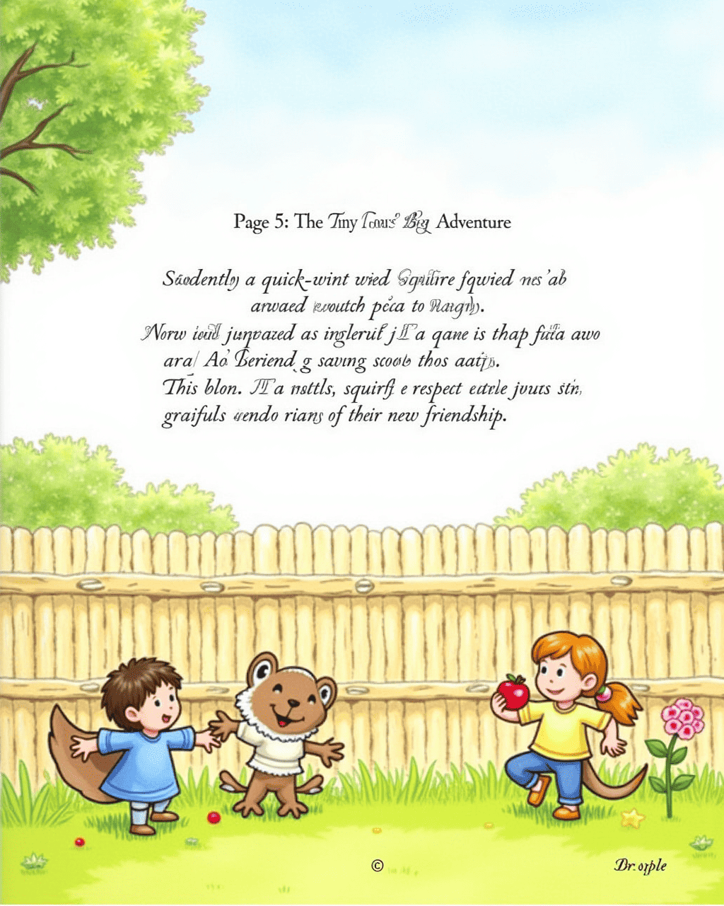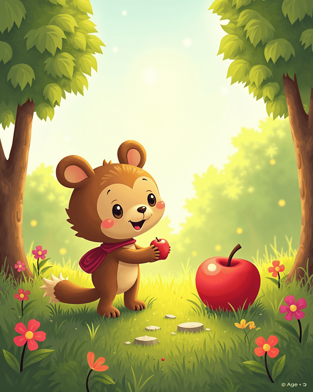 Suddenly a quick-witted squirrel named Sandy swooped down to snatch the apple. Tilly and Benny shouted a brave plea to help. With quick jumps, Tilly pushed the squirrel away, and Benny gently scooped the apple back. The squirrel, seeing kindness, promised to respect future harvests. The friends celebrated with a tiny dance, grateful for the safety of their new friendship.