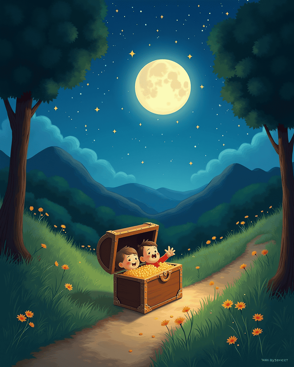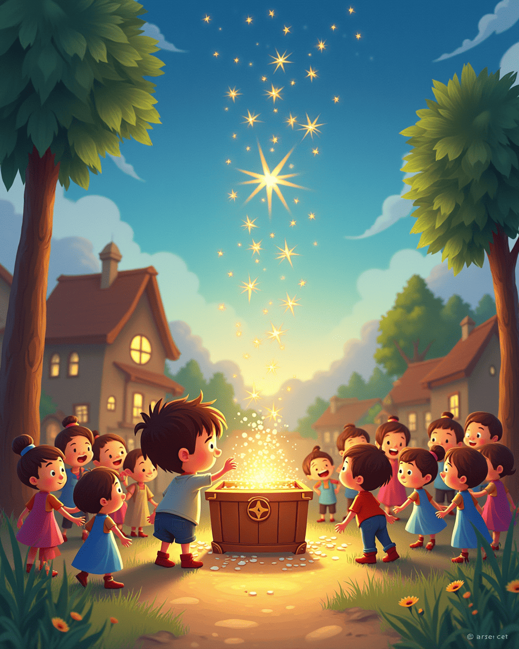 When the village clock chimed at dusk, Milo and Luna returned with a bright chest.