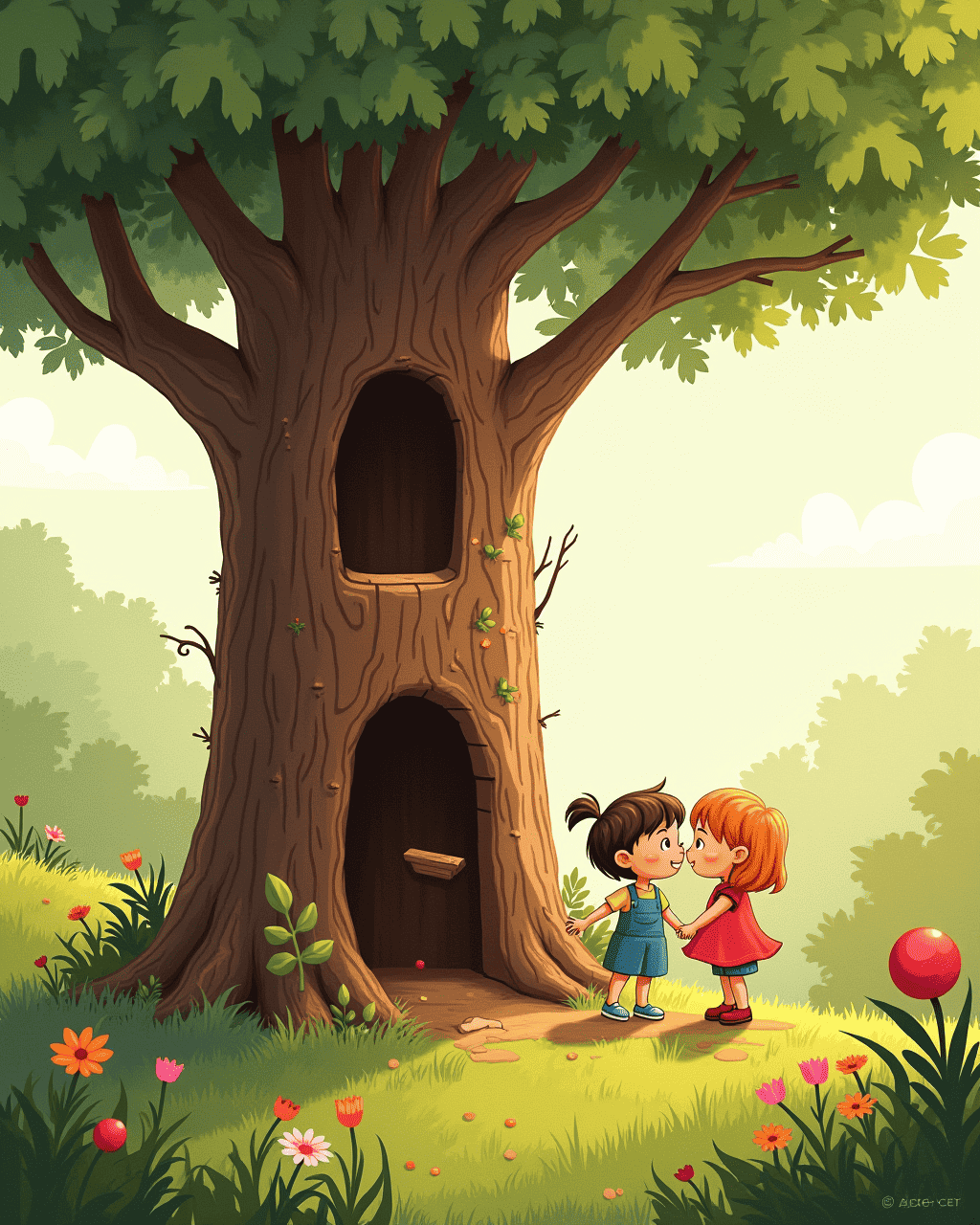 1. Lucy and her brother Milo were playing in the backyard when they saw a lonely oak tree with a wide hollow. 2. “Let’s build a treehouse inside,” Milo exclaimed, his eyes shining with excitement. 3. They gathered fallen leaves, twigs, and a shiny red ball, imagining a cozy hide‑out for their secrets. 4. The tree seemed to listen, as if cheering them on with a gentle sway. 5. With sticky hands and giggles, they began sketching the outline in the dirt.