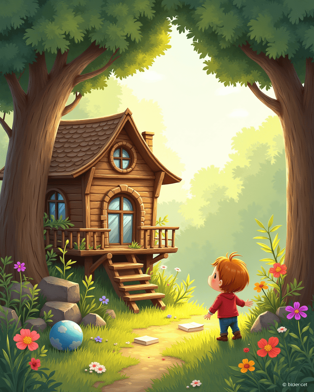 1. Inside the treehouse, they placed a small pile of found trinkets—one bright feather, a shiny bottle cap, and a pressed flower. 2. They called it the “Secret Library,” where each item represented a treasure story. 3. Lucy wrote notes beside every object, describing its adventure. 4. Milo set the ball by the window to remind them that joy can be found in small things. 5. They spent the afternoon reading their own stories, whispering that imagination was the greatest treasure.