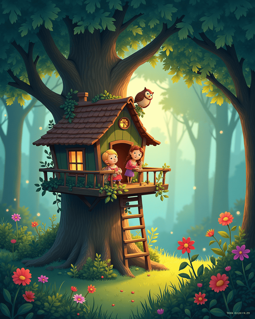 1. When the sun dipped, the trees turned a deep teal, and the leaves rustled like sleepy lullabies. 2. Milo and Lucy snuggled in their tiny bed made of soft leaves. 3. They imagined the treehouse as a floating ship sailing across a starlit sea. 4. Suddenly, a tiny owl perched on the ladder’s top, adding mystery to the night. 5. The owl seemed to watch over them, keeping the secret treasure safe.