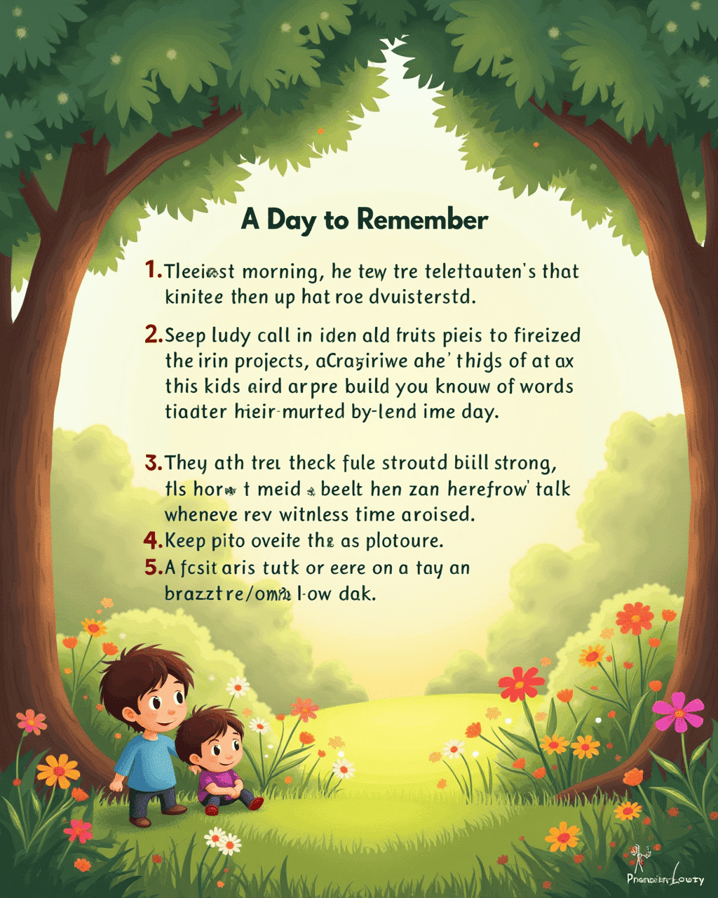 1. Inspired by their treehouse, the children began planting a small patch of bright marigolds beside the oak. 2. They invited friends to help water the flowers and share stories of their own tiny adventures. 3. The garden grew and attracted butterflies, turning the backyard into a lively wonderland. 4. Parents noted that their children’s imagination shone brighter during play. 5. The treehouse became a symbol of teamwork, growth, and shared dreams.