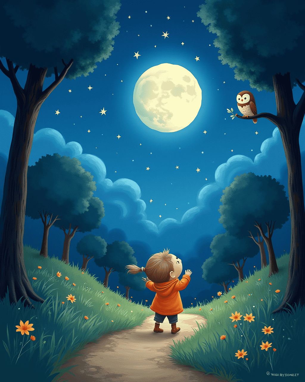 One starry night, Tilly whispered to the wind, sharing her desire to explore the night sky. The wind carried her wishes to the wise old Owl, who perched on a high branch. Owl advised her to travel across the Whispering Woods to find the Moon’s Lantern. Tilly thanked Owl, fluttering upward at the moonlit path. She felt the cool breeze, eager to set off on her adventure.