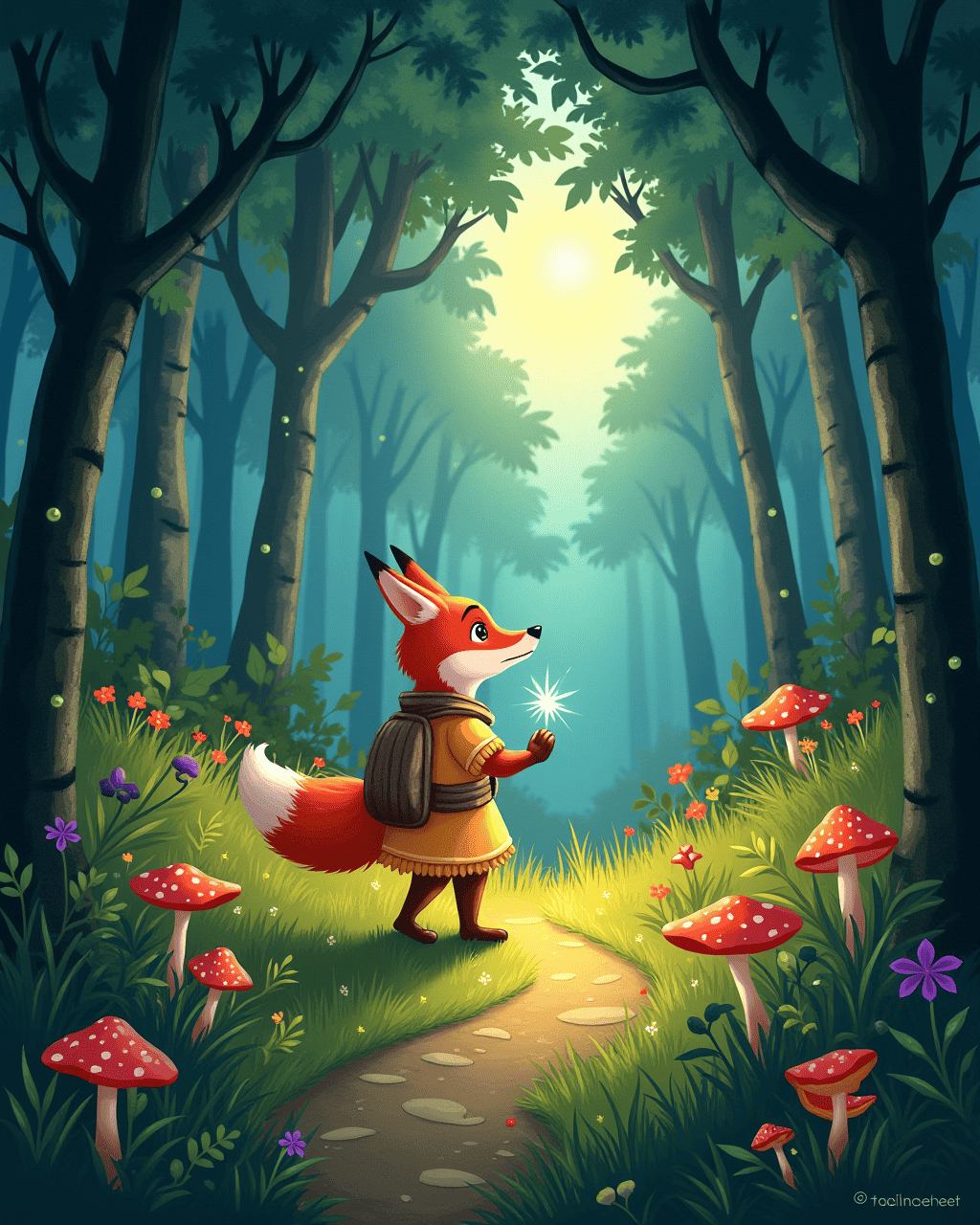 Tilly crossed the rustling leaves and glowing mushrooms, her tiny light guiding the way. She encountered a friendly fox who offered to lead her through a hidden clearing. The fox's eyes sparkled as she followed a maze of silver birch trees. They shared stories of the sky and the distant stars. By dawn, Tilly emerged with a clearer idea of where to find the Moon’s Lantern.