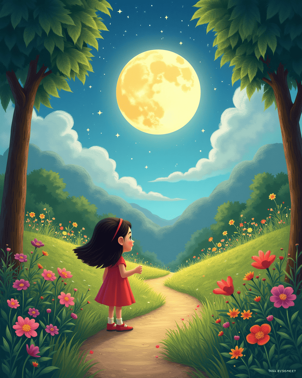 At last, Tilly reached the Moon’s glittering garden, where the Moon itself appeared gentle and kind. The Moon welcomed Tilly with a warm smile and explained that the lantern was hidden beneath the ancient silver bridge. Tilly thanked the Moon, asking to bring the lantern back for her friends. The Moon promised that if she found it, she would help her return home safely.