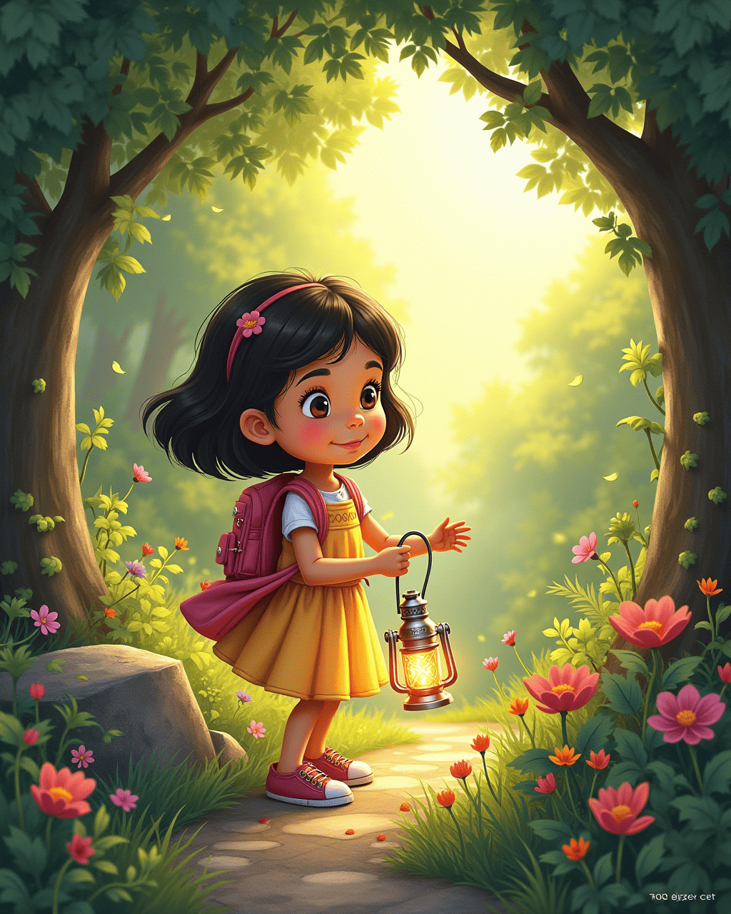 With determination, Tilly searched beneath the bridge, feeling the cool stone beneath her glowing fingertips. She discovered an ancient silver lantern, its light shimmering like a small star. The Lantern gleamed, and Tilly held it tightly, feeling the promise of brighter moments. She hurried back over the silver bridges and through the Whispering Woods, guided by the lantern’s gentle glow. By sunrise, the forest had transformed into a sea of golden light.
