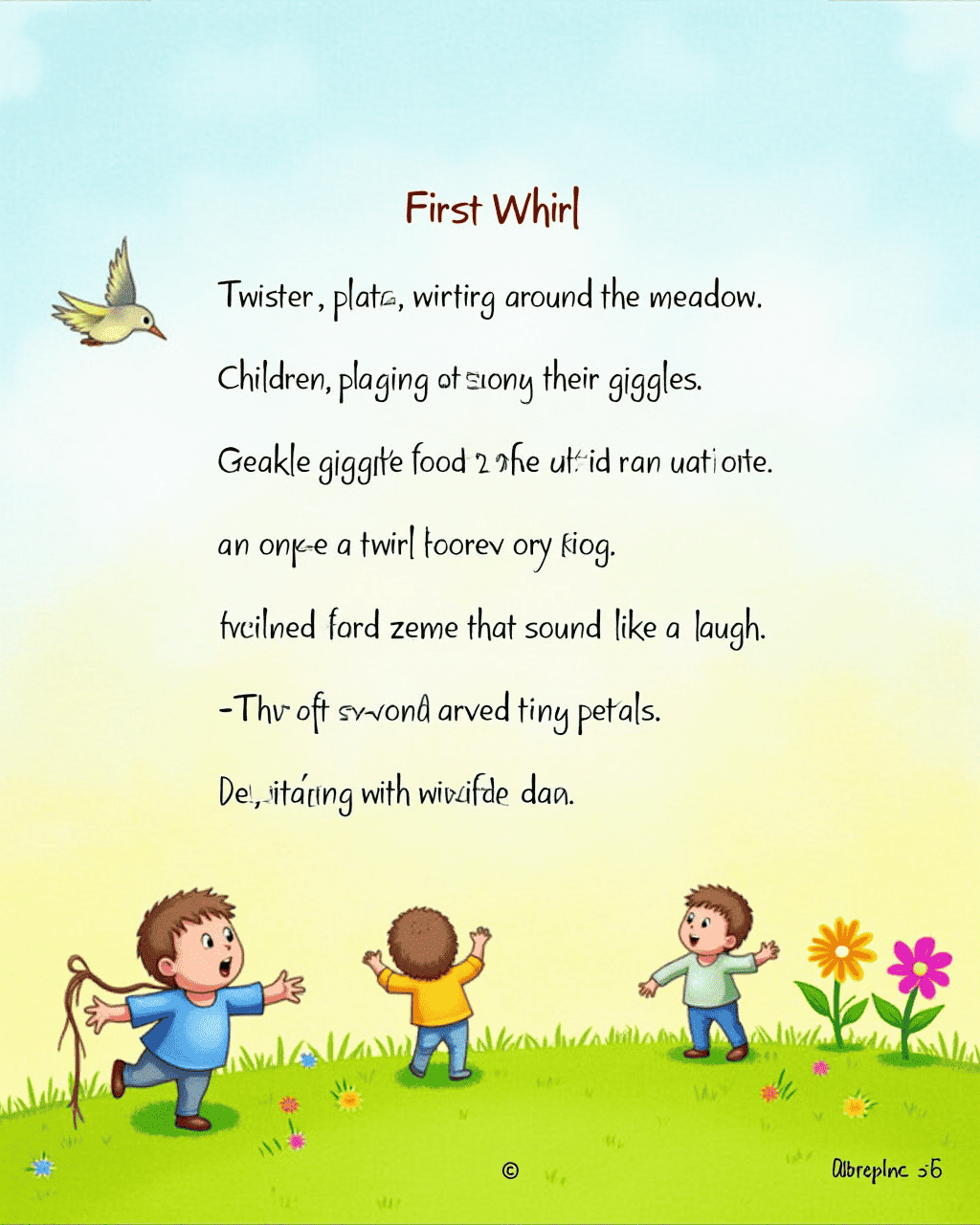 Twister twirled, swirling around the meadow. Children playing nearby giggled as the twirl lifted their hats. An elderly bird perched on a branch and sang. Twister hummed a tune that sounded like a laugh. The wind carried tiny petals, painting the air with color.