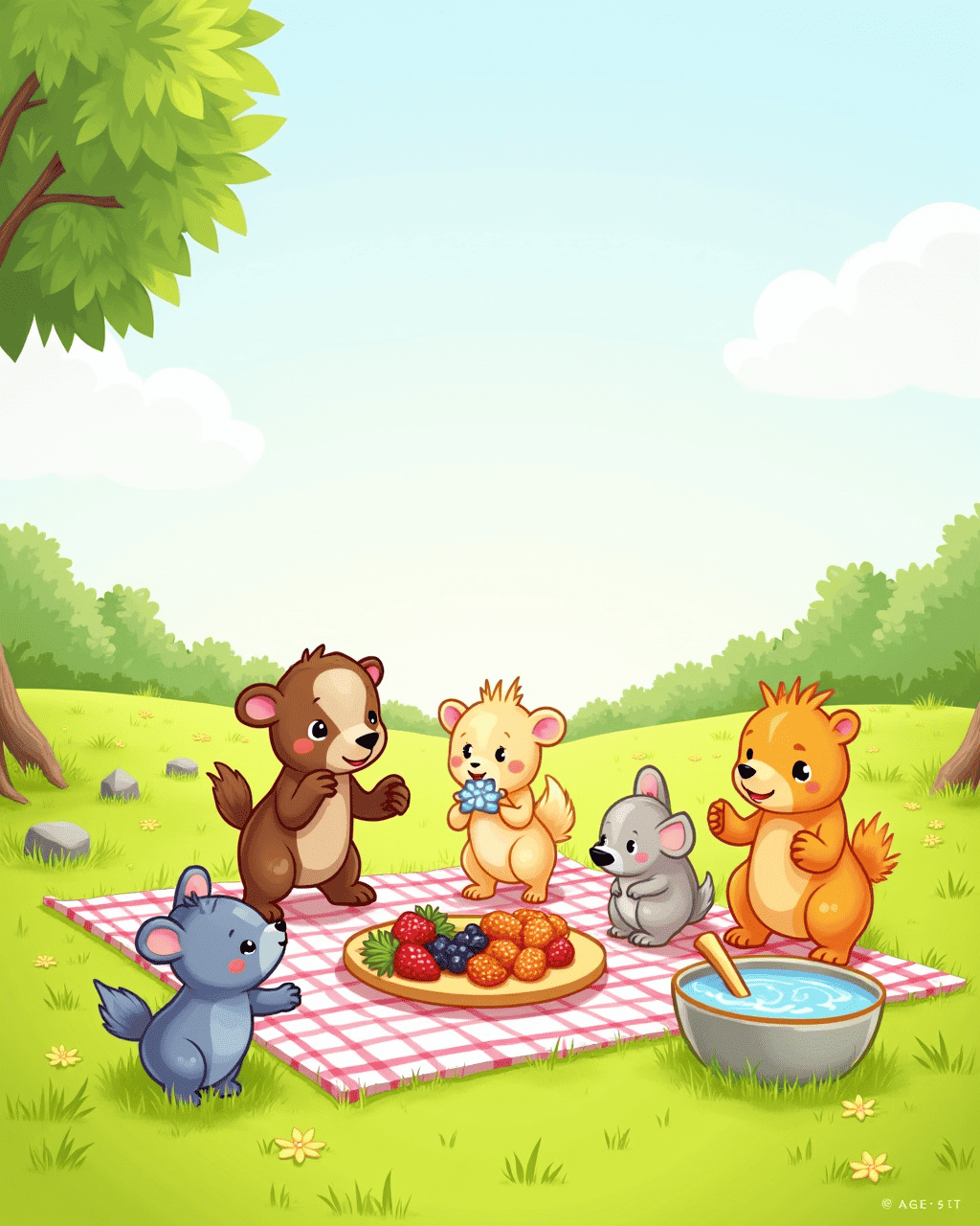 The next day, Twister invited Luna and the meadow’s other animals to a picnic. They shared sweet berries, crunchy leaves, and a bowl of fresh water. Twister’s wind cooled the hot midday sun.