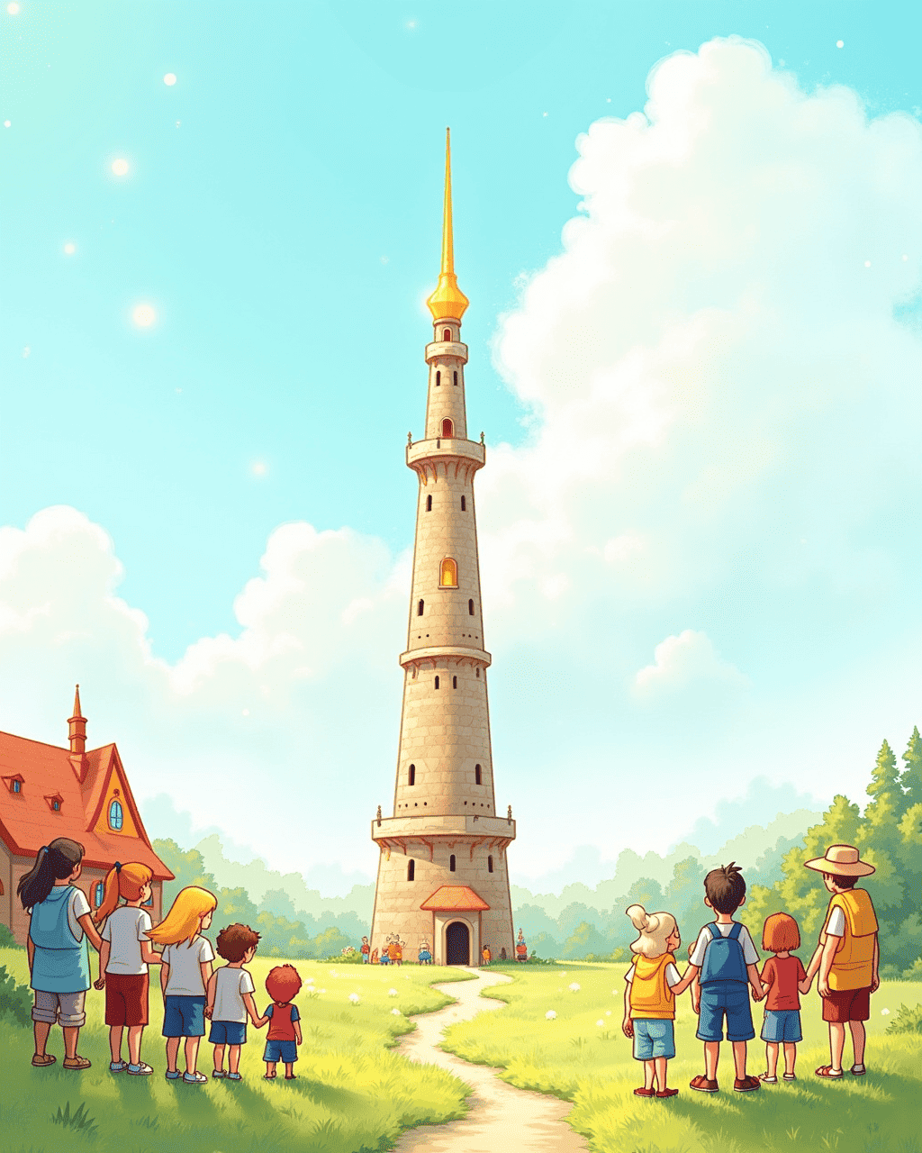 In the sunny village of Willowbrook, the townsfolk gathered to marvel at the tallest tower ever built. The tower's golden crown sparkled under the summer sun. Mrs. Lillian, the baker, offered sweet buns to the children who watched in awe. Mr. Quill, a curious inventor, whispered about the tower’s secret mechanism. A child named Finn tugged the flag, and the tower wobbled just a hint.