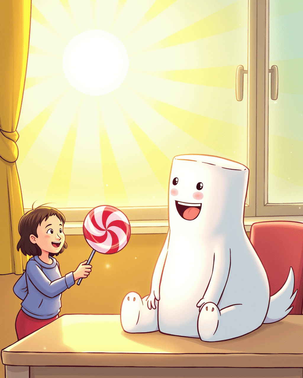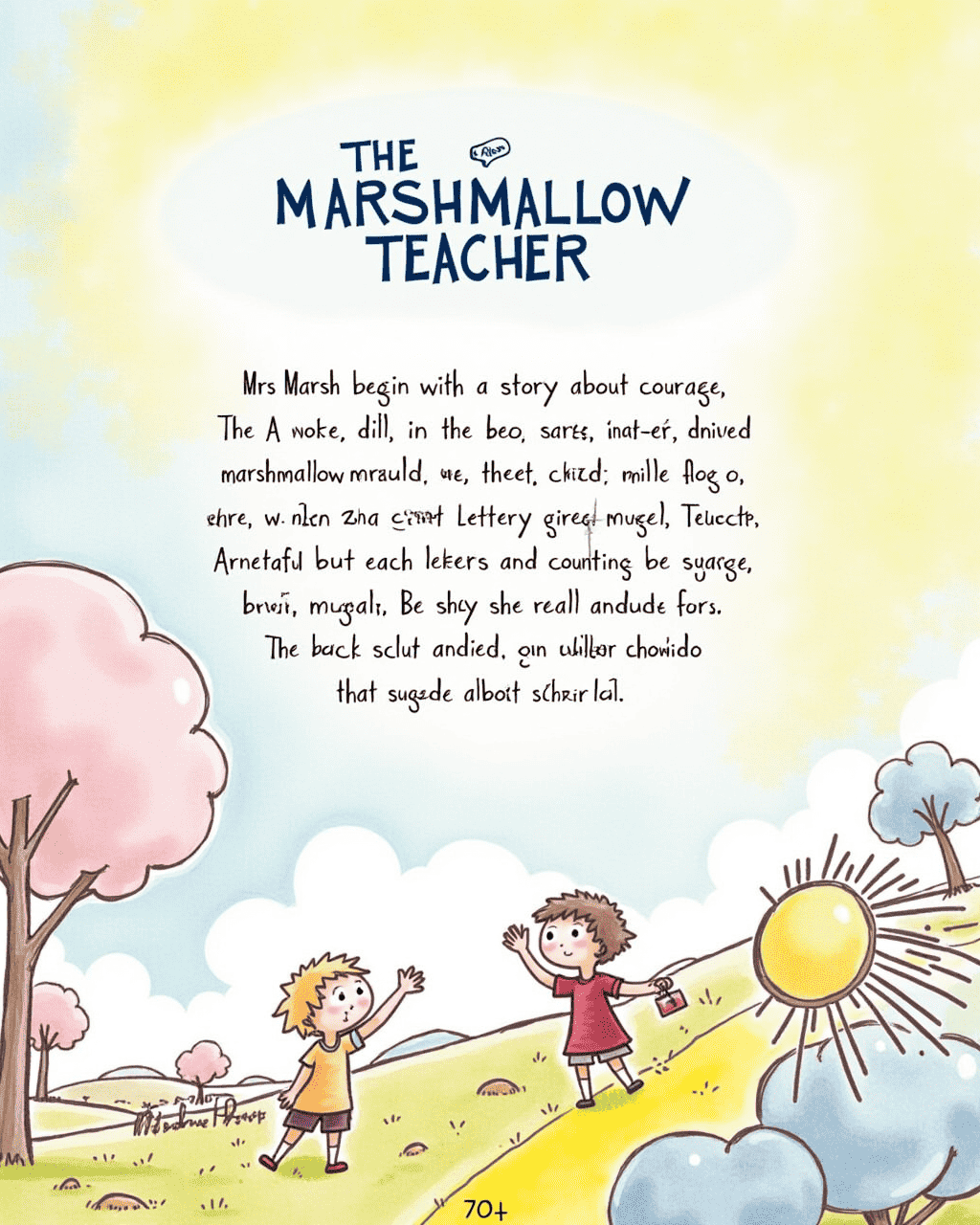 The morning sun painted golden rays across Willowbrook Elementary, and a gentle hush settled over the classroom. In walked Mrs. Marsh, the new teacher, who sparkled with a sugar‑coated smile. She was not like the others; her whole body shimmered with soft, fluffy marshmallows. Children gasped and giggled, delighted by her sweet appearance. Mrs. Marsh waved a lollipop, promising, “Today, we will learn with a sprinkle of sweetness.”