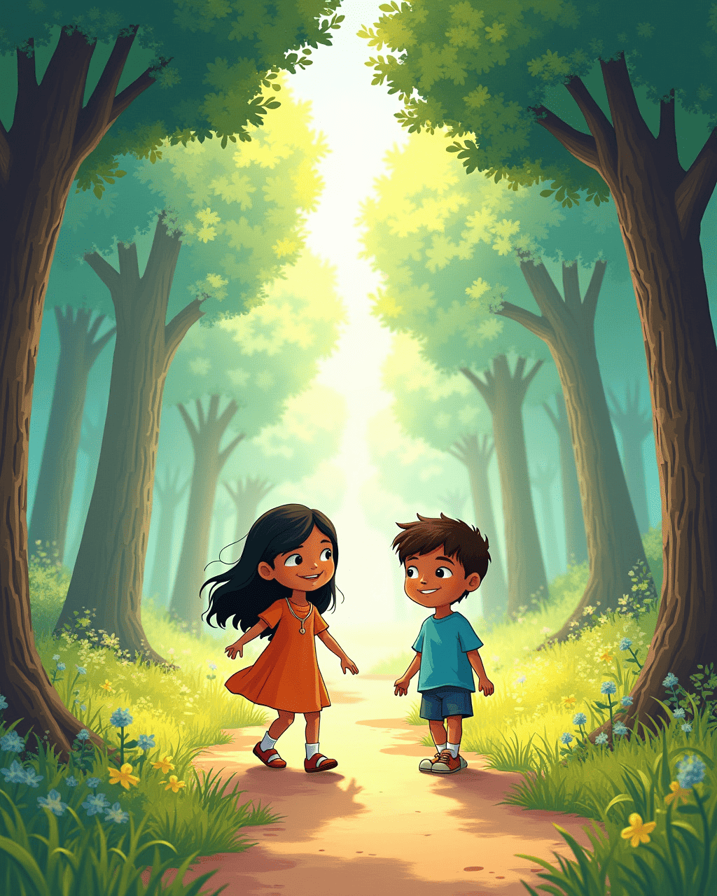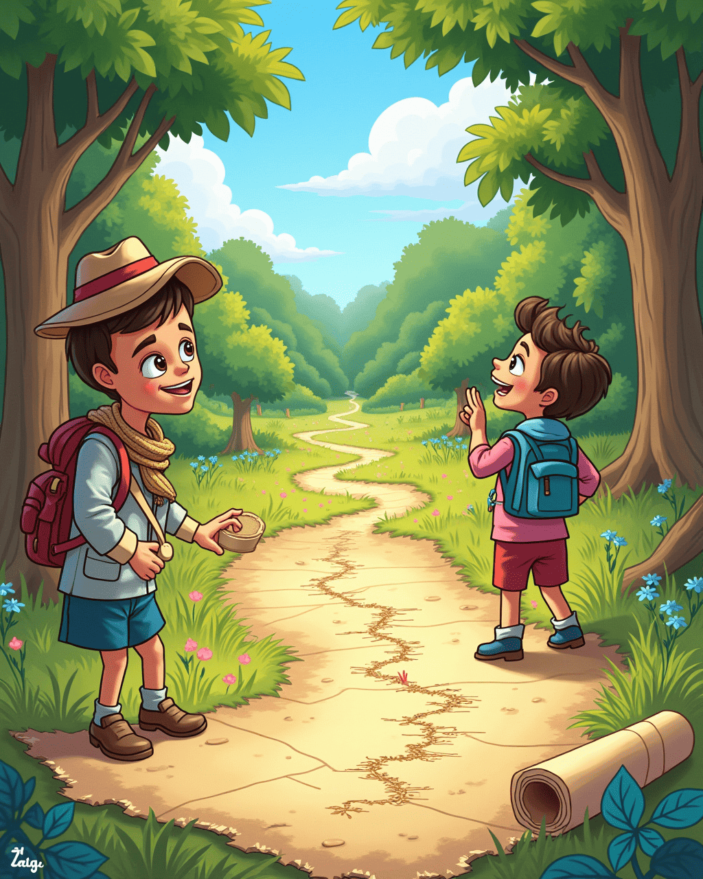 On a bright spring morning, Maya and her brother Leo decided to explore the attic of their grandma's old house. While they sifted through dusty boxes, a rolled parchment fell out. It was an old map, its edges frayed and ink faded to a mysterious shade of blue. The map showed a winding trail that led deep into the heart of the nearby forest. Curious, the siblings traced the route with their fingers, feeling a gentle buzz of excitement.