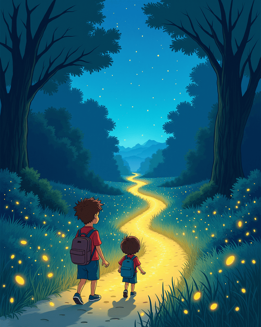 Following the clock's glow, the trail turned into a path lit by thousands of fireflies. The little lights danced above them, outlining a road that stretched into the blue dusk. Each step the children took made the fireflies flicker brighter, as if inviting them further. Suddenly, a soft voice floated in the air, saying, "Follow me to find what you seek." Maya and Leo felt a surge of adventure as they advanced.