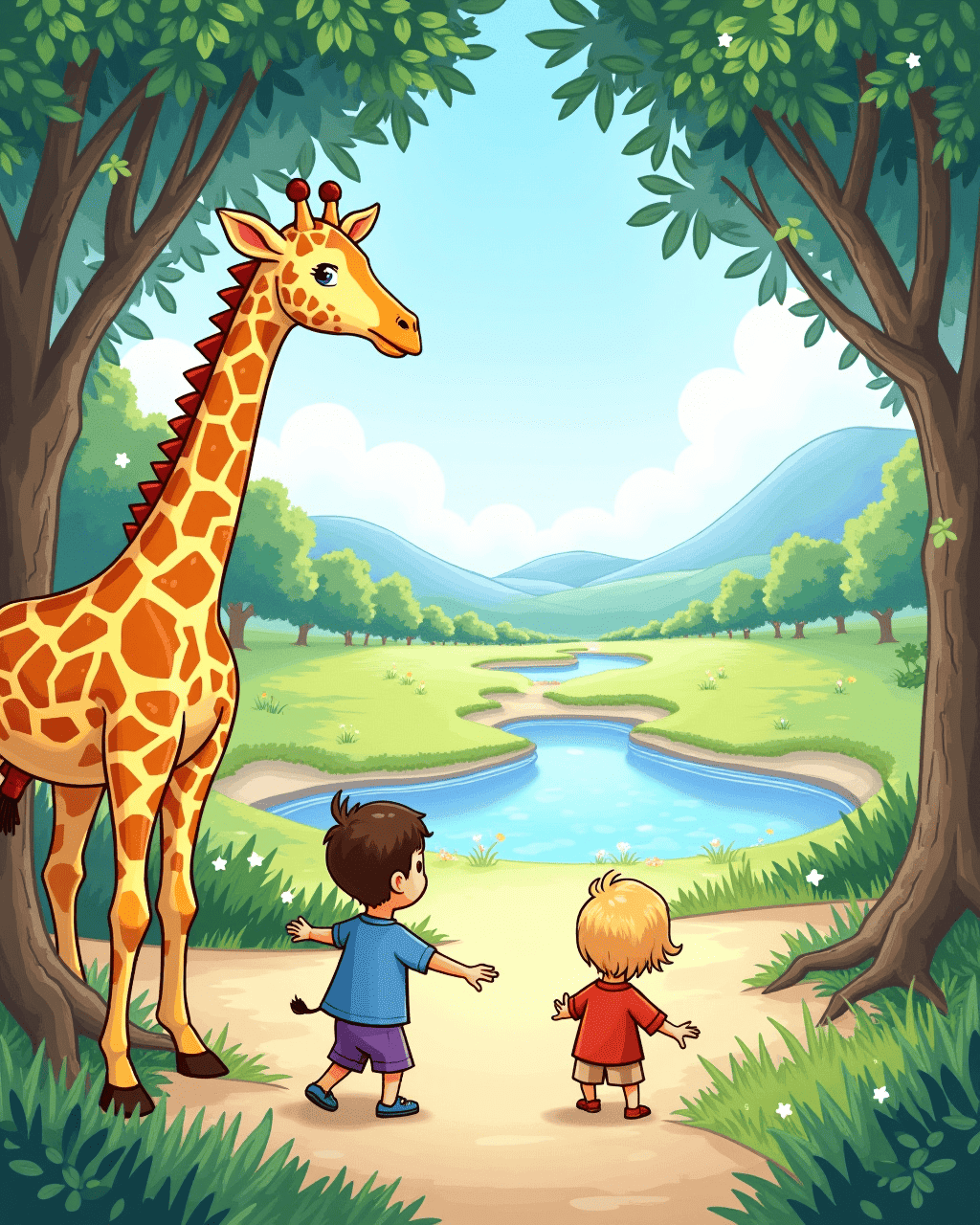 At the heart of the twinkling path, a gentle giraffe named Gigi emerged from behind a curtain of vines. She wore a tiny silver bell around her neck, which chimed when the wind blew. Gigi spoke in a warm tone, "Welcome, brave ones. I know the way to the hidden pond, but first you must learn about the time that waits." The siblings nodded and listened attentively as she told stories of past adventures.