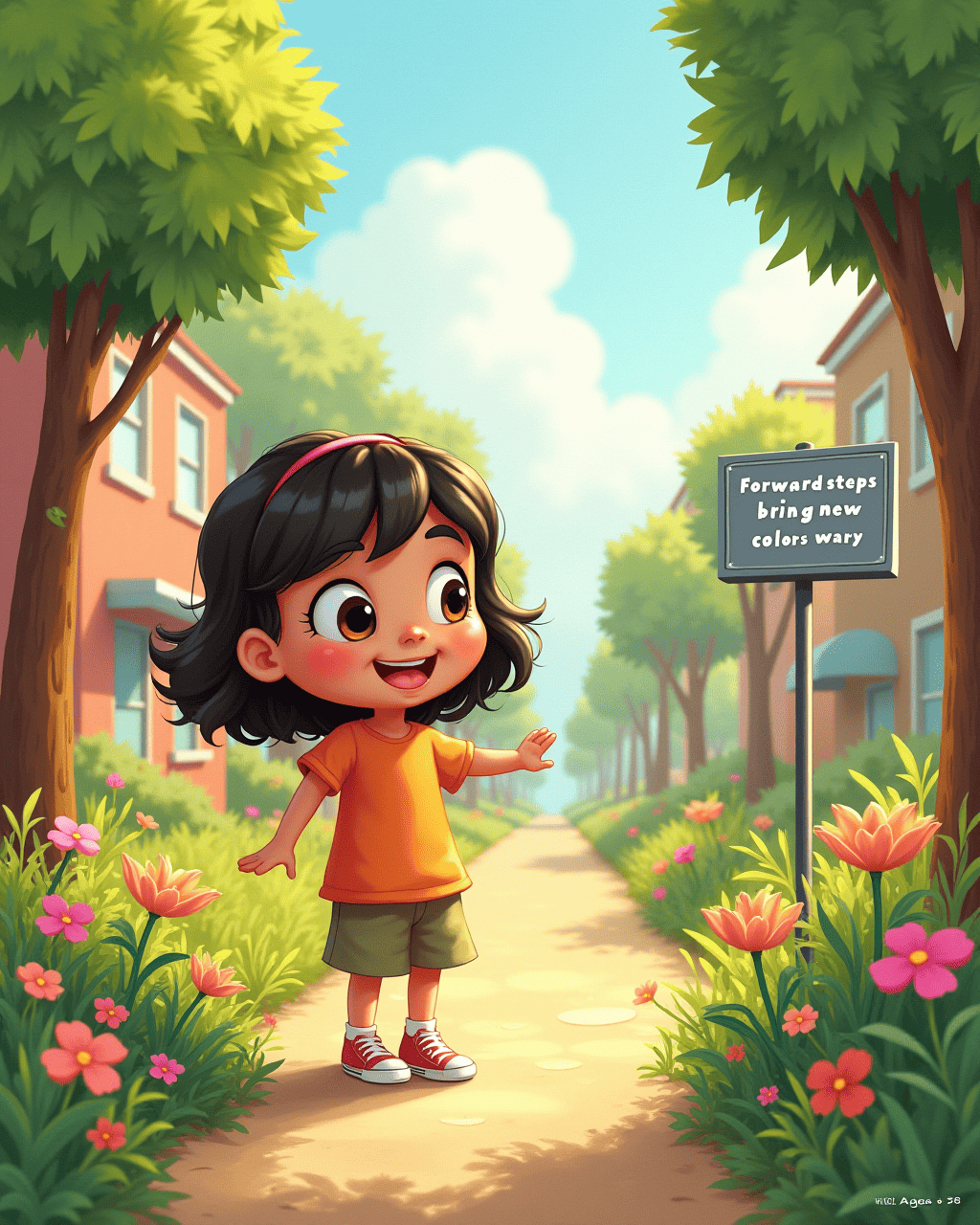 Further down Main Street, a silver sign read: “Forward steps bring new colors.” Mia hesitated but imagined bright paint swirls if she moved ahead. She placed her left foot forward, pushing against the familiar backward motion of her friends. The world shifted; the paint shimmered in colors Mia had never seen before. Her cheeks flushed with excitement as she felt the town gently support her forward stride.
