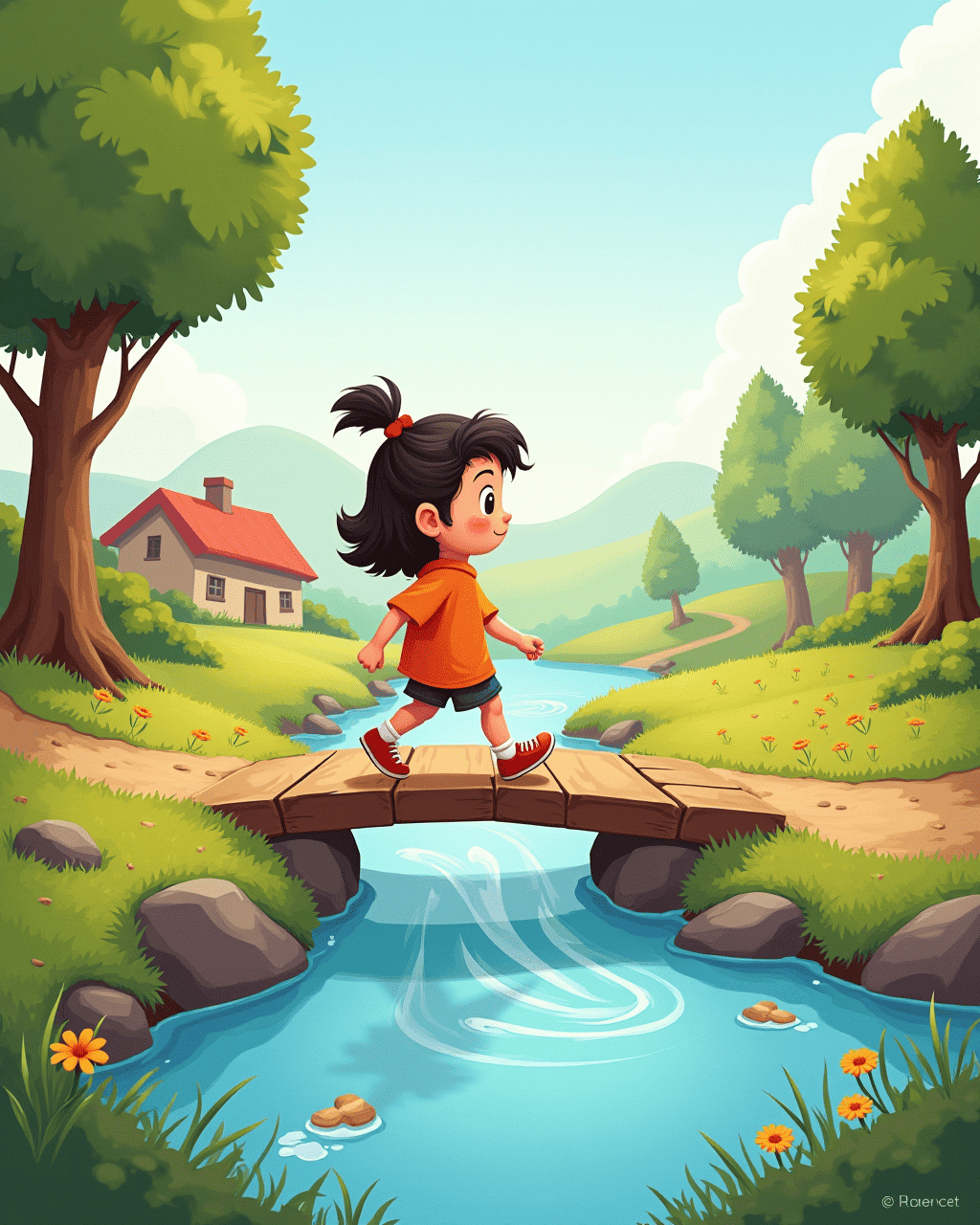 Mia continued walking forward until she reached the edge of the town, where a small wooden bridge crossed a quiet stream. The usual backward stream flowed slowly, but as Mia stepped forward, the water surged ahead, creating a sparkling rhythm. The townspeople, watching from the far bank, cheered unexpectedly, seeing her move in the right direction. She felt a warm wind on her back, whispering stories of adventure and courage.