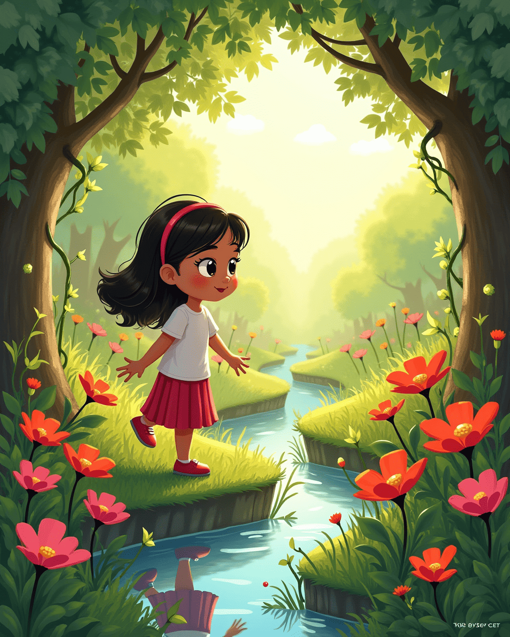 At the heart of the stream, hidden behind a curtain of vines, lay a secret garden blooming with bright, bold flowers. The flowers sang softly as Mia approached them, their petals lifting in rhythmic forward motion. Each bloom revealed an inscription, “Those who walk forward keep the wonder alive.” She laughed, delighted that the garden seemed to applaud her choice. The garden seemed to be the town’s hidden treasure, revealed only by forward steps.