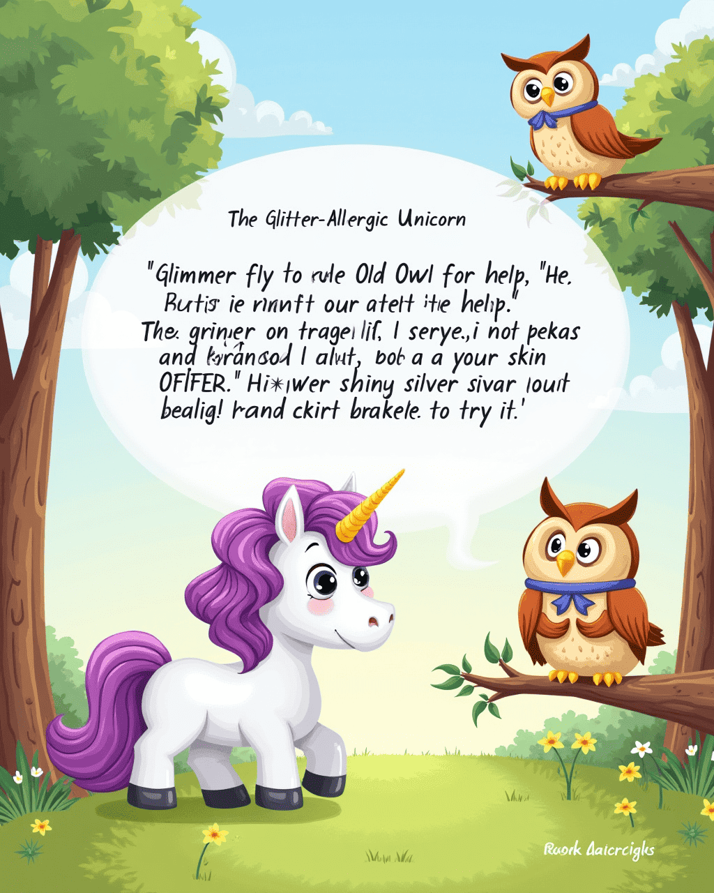 Glimmer flew to the wise Old Owl for help. He perched on a branch and listened to her troubles. The Owl whispered, "Glitter is bright, but if it pokes your skin, be careful." He offered a shiny silver scarf to shield her from glitter. Glimmer clapped her hooves in gratitude, excited to try it.