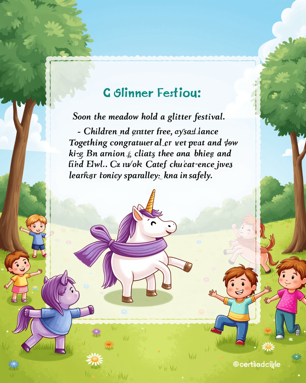 Soon the meadow held a glitter festival. Children and animals danced together. Glimmer brought her glitter‑free scarf and smiled. The wise Owl congratulated her new protection. Everyone cheered, and Glimmer learned that being careful doesn’t mean losing joy.