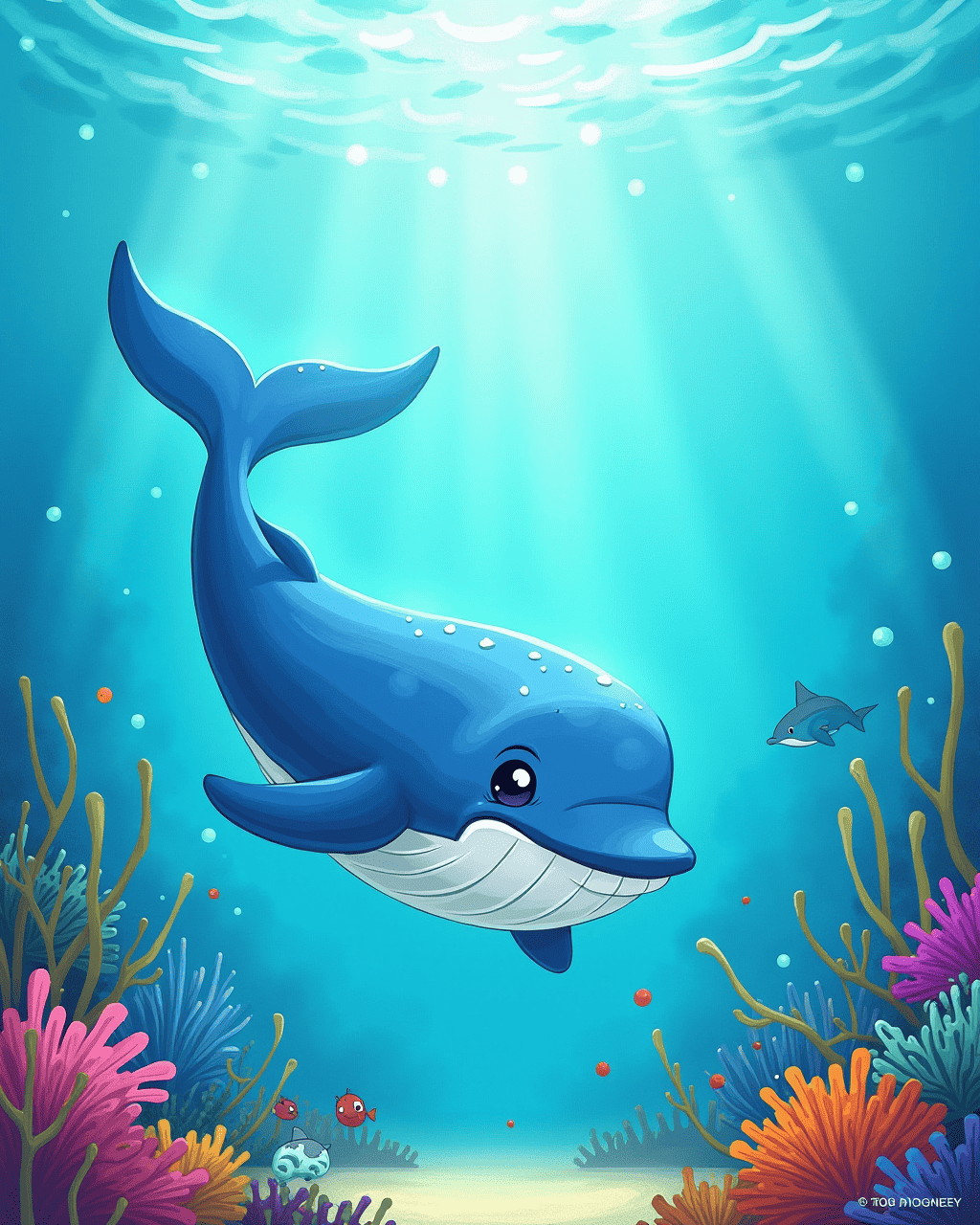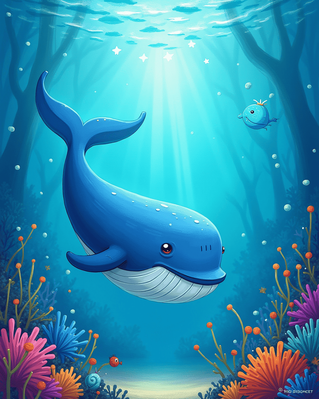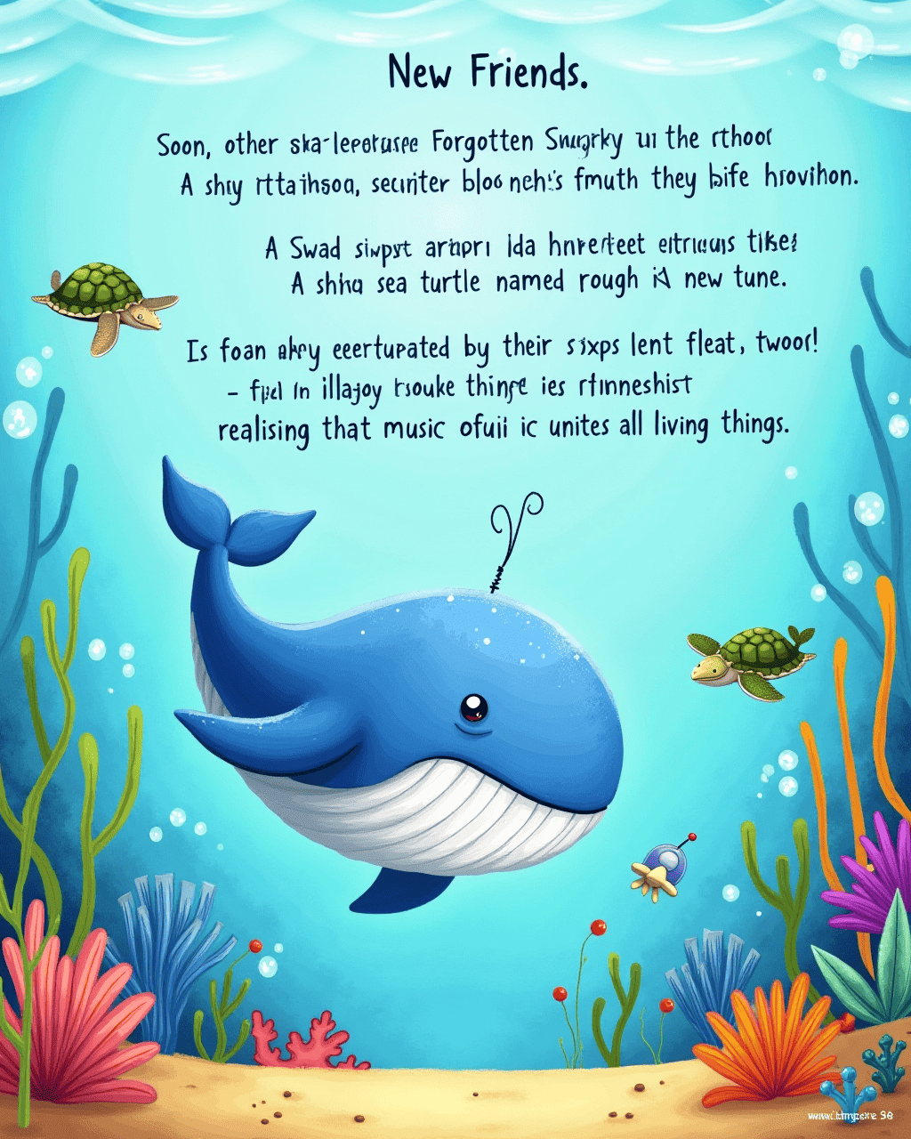 Soon, other sea creatures joined the chorus. A shy octopus painted colors to match the rhythm. A shy sea turtle named Tide found a new tune. Lullabies floated around them, weaving a tapestry of friendship. The whale felt humbled by their support, realizing that music unites all living things.