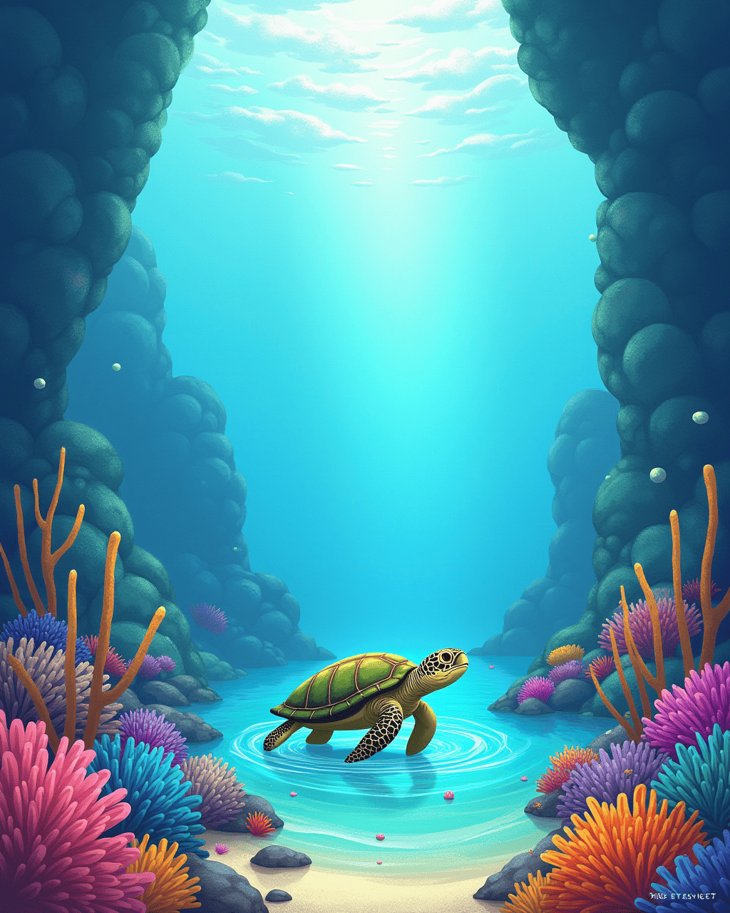 They followed the singing reef to a secret cove painted with coral of all colors. In the cove, a wise turtle named Tessa swam slowly, her shell a map of swirling currents. “The treasure of kindness,” she said, “can be found in the heart of those who help others, not in shiny gems.” Lily, Finn, and Tessa shared stories of kindness, making the water shine brighter.