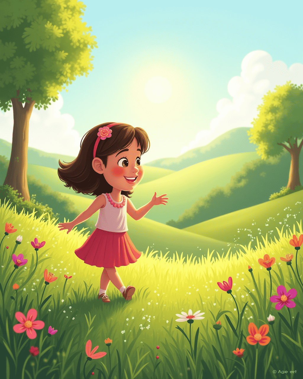 The sun peeked over the hills of Willowbrook, and little Emma brushed her fingertips against the cool grass. She loved to play by the brook where the silver fish danced. Today, a breeze fluttered by, carrying a curious voice that tickled her ears. The wind whispered, "Come explore the hidden meadow beyond the ridge." Emma's eyes widened in excitement. Determined, she nodded, ready for an adventure.