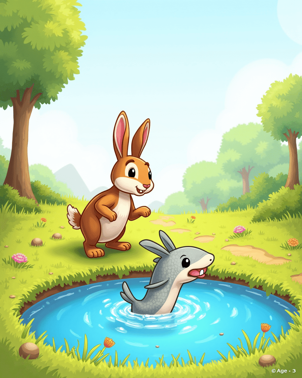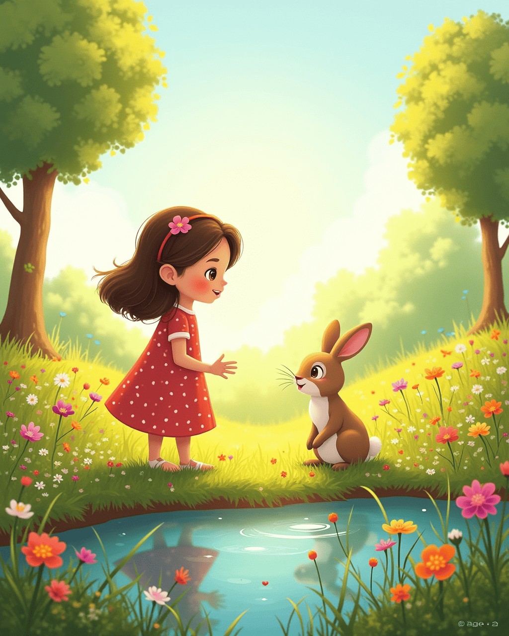 The rabbit introduced herself as Ruby, the guardian of the meadow. Ruby told Emma that the Whispering Wind carried stories from faraway valleys. Together, they hopped over a mossy patch to reach a sparkling pond. A silver fish leapt from the water, shouting, "Join us for a splash of adventure!" Emma laughed and dove into the cool liquid.