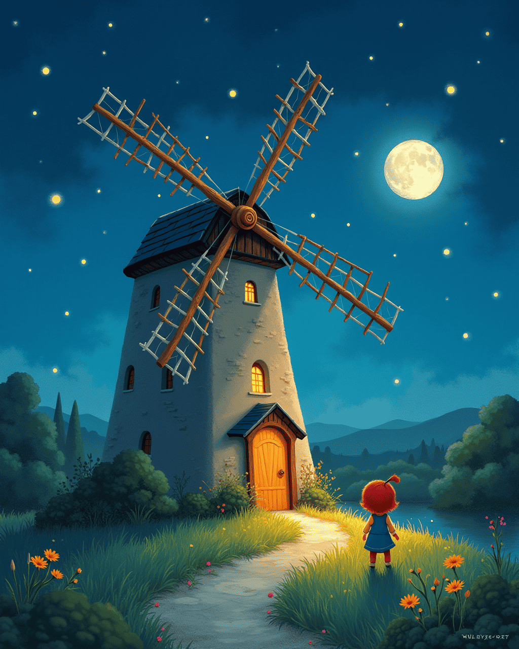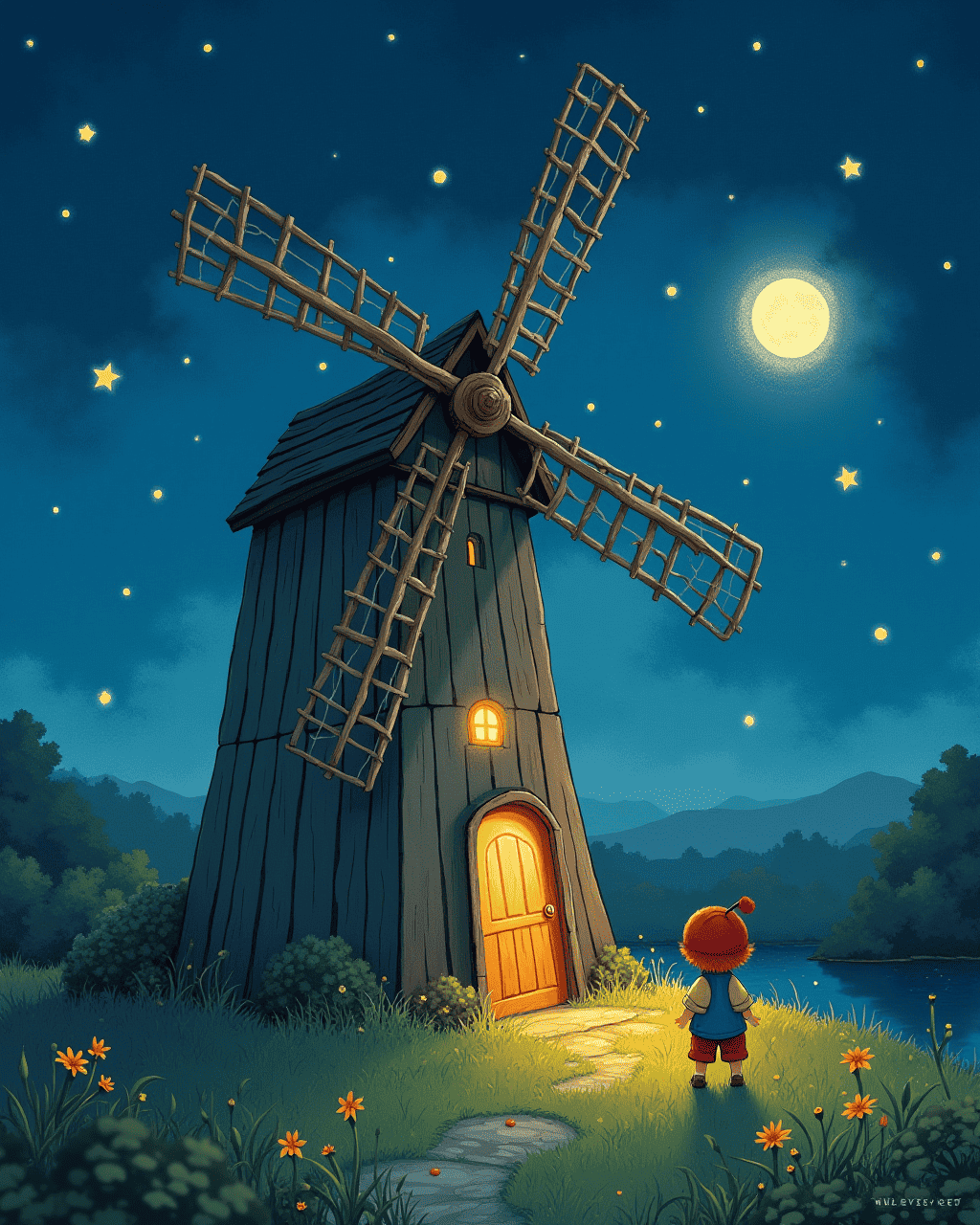 The first misty morning, Lily and her brother Milo arrived at the old windmill on the hill. They had heard stories that the windmill could whisper secrets of the wind. As they stepped closer, the wooden door creaked open on its own. Light sparkled through the slats, revealing a circle of painted stars. The wind sang softly, and the windmill's gears began to turn, as if breathing a new day.