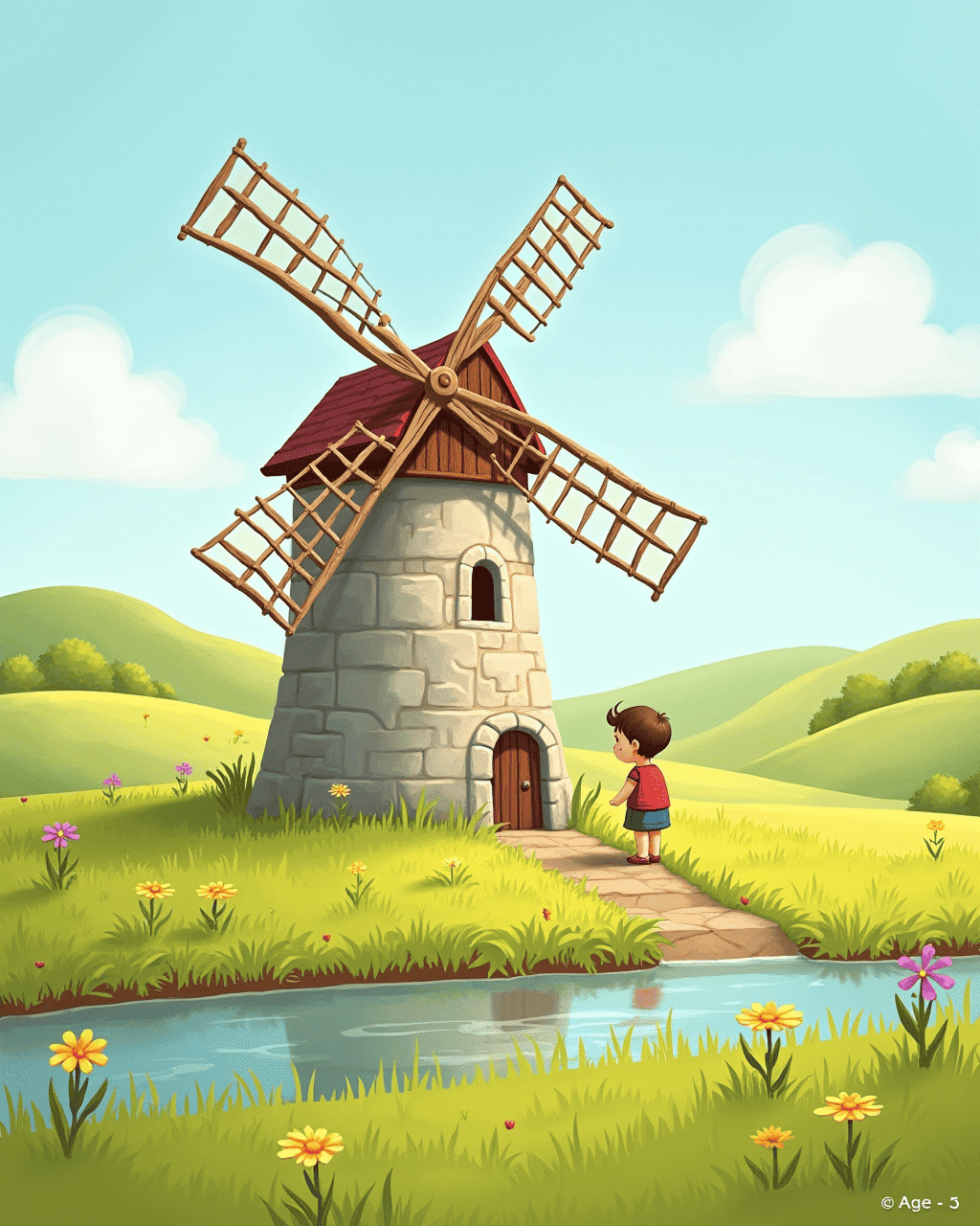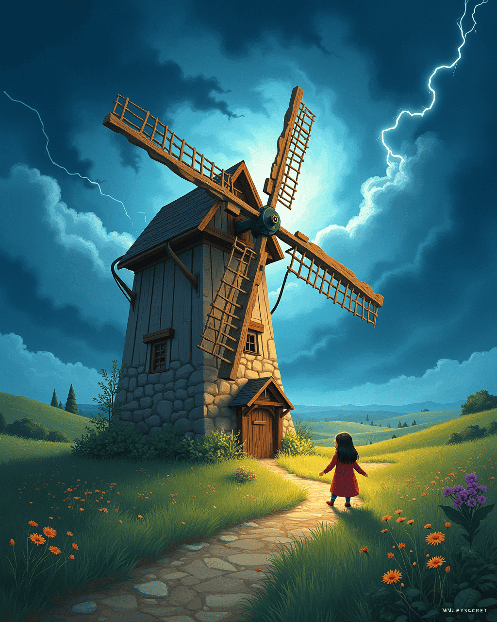 As the storm hit, lightning flashed, yet the windmill's wooden walls stayed unshaken. A voice rang from inside the mill: 'I am the memory of the wind, I keep the stories.' The windmill turned its gears faster, funneling the storm's winds away from the village. The elders watched in awe as the wind danced around the stone structure like a dancer. It was as though the wind itself was protecting everyone with its gentle whisper.