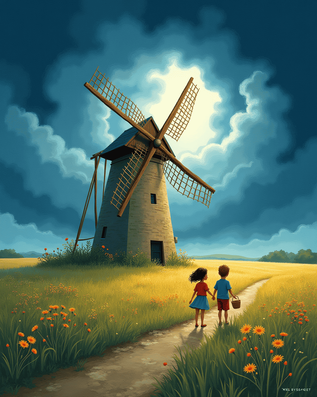 Midday came, and clouds gathered like a giant, angry quilt. The village elders warned the children that a storm was about to roll in. Lily and Milo hurried back with their baskets, but the windmill waited. The wind began to howl, its voice rising in a crescendo, turning the sails in a swirling dance. Milo whispered, 'Stay close, the windmill might shield us.'