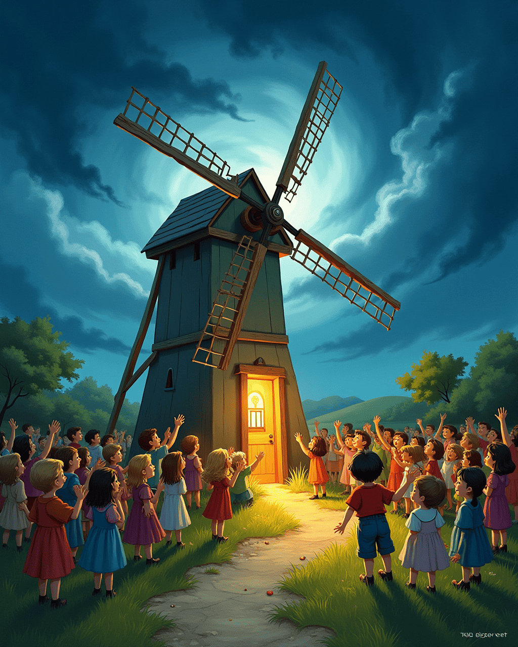 After the storm faded, the villagers gathered around the windmill, clapping and singing. They celebrated the strange protection that had kept them safe. The windmill's door opened wider, revealing a lantern lit by the last sunset. Children swirled around its blades, laughing like wind currents themselves. Lily realized that the windmill was not just a machine, but a guardian who listened to the wind and shared its song.