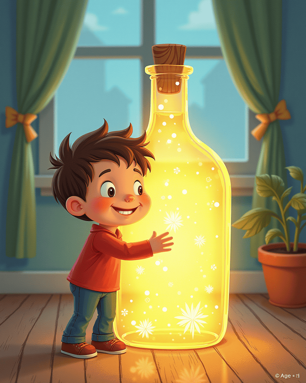 Sam found a shiny, old bottle in the attic of his grandmother's house. He cleaned it with a rag and whispered his name into the empty glass. The bottle seemed to glow with a warm, amber light when he held it close. Curiously, he decided to add his secrets to it. He counted carefully, and each worry he tucked inside felt lighter. The jar promised to keep his secrets safe.