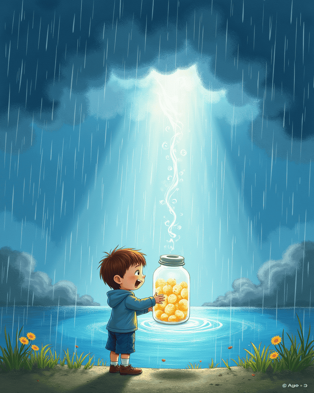 When the rain began to pour, Sam remembered his friend Lily's birthday coming up. He felt nervous about her gift. So, he wrote a note, “I hope Lily's birthday is special,” and put it in the jar. The sound of raindrops made the bottle sing like tiny bells. The worry slid into the water, swirling away. He felt a tiny breeze of relief.