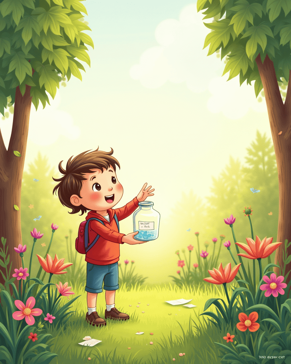 During recess, Sam found a quiet corner in the school garden. He thought about the math test he had to study for. He scribbled: “I want to get an A,” and placed it inside. The jar bubbled, as if the garden plants were cheering. Sam felt the test worry drifting down, leaving him calm. He promised to work hard, but also to laugh.
