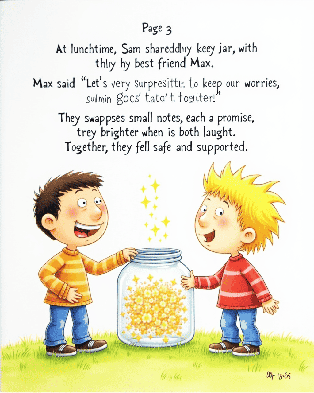 At lunchtime, Sam shared his jar with his best friend Max. Max was very surprised to see the glass glittering. Max said, “Let’s keep our worries safe together!” They swapped small notes, each one a promise. The jar glowed brighter when they both laughed. Together, they felt safe and supported.
