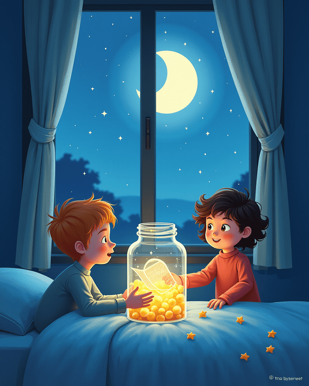 At night, Sam looked out his window. The stars twinkled like tiny, bright beads. He placed a letter in the jar: “Thank you, Worry Jar.” The jar hummed a quiet lullaby, and he fell asleep with a smile. The next day, he felt ready, knowing that every worry could be shared and set free. The jar had become his best friend.